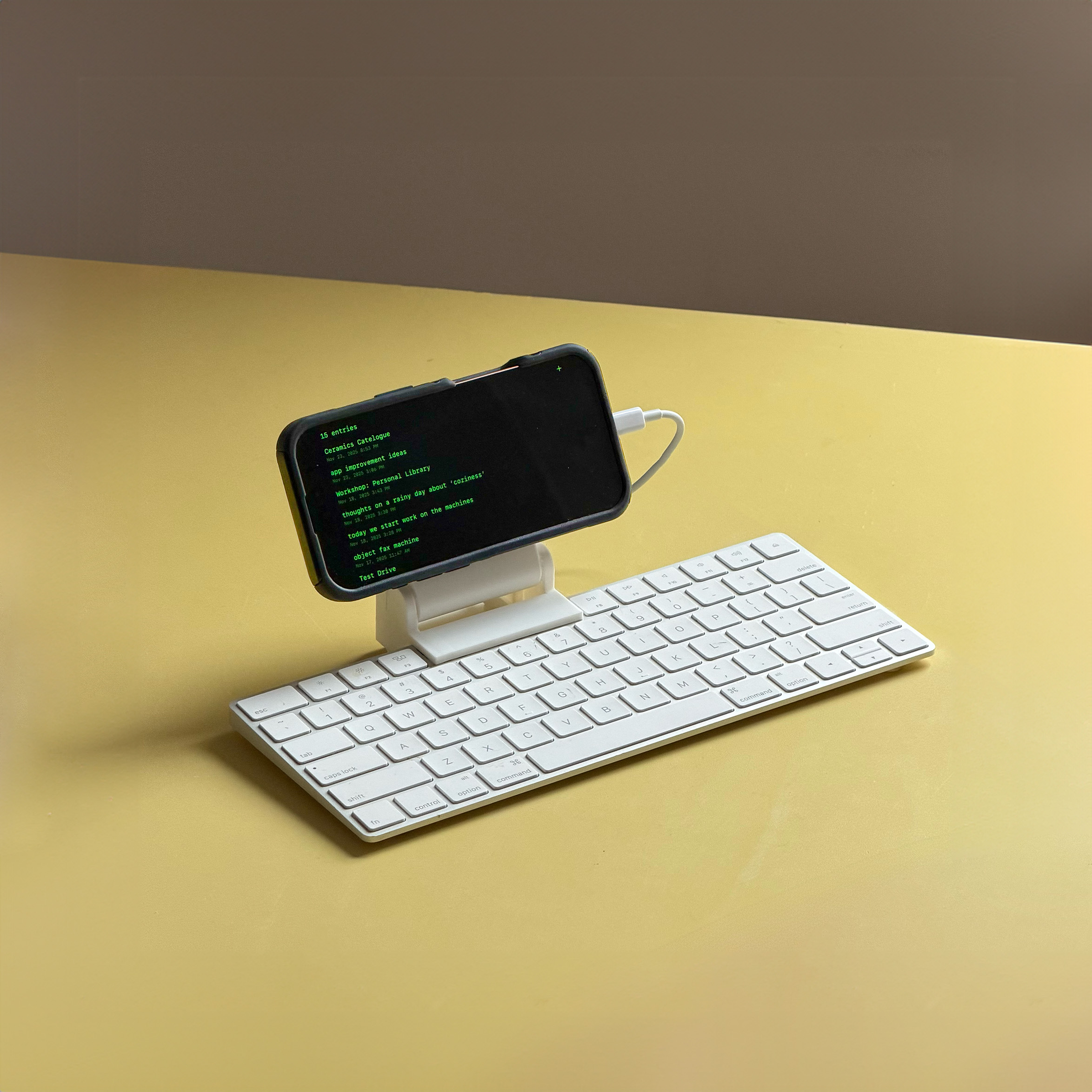 I tried messing with more tinkery writer deck setups using Raspberry Pis, but ended up using the computer that I always have in my pocket instead. I built a custom app to enable the desired software restrictions and a simple MagSafe-compatible 3D-printed hinge to slip onto the keyboard that I love. By making the most of iOS Shortcuts capabilities, I was able to auto-enable 'Do Not Disturb' whilst in the app and add a quick launch button on the lock screen, optimizing it for writing first thing in the morning.
